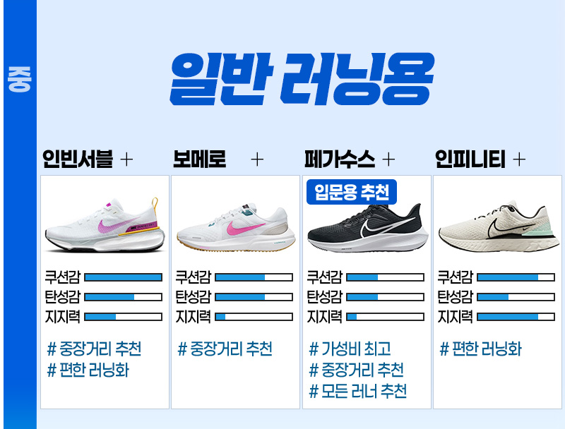 - 나이키 줌 페가수스 : 경량화된 디자인으로 빠른 러닝에 적합합니다.