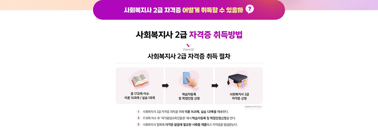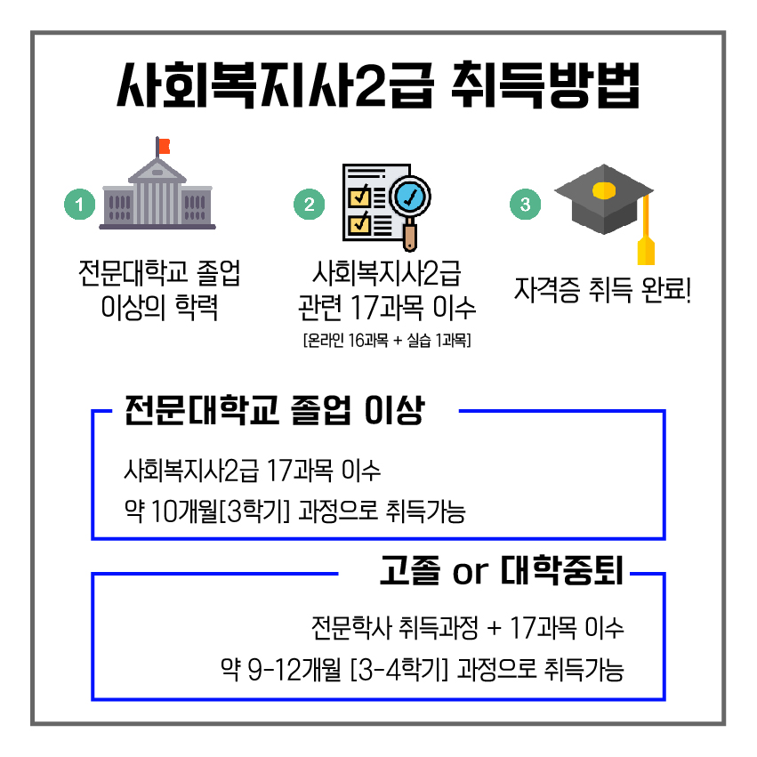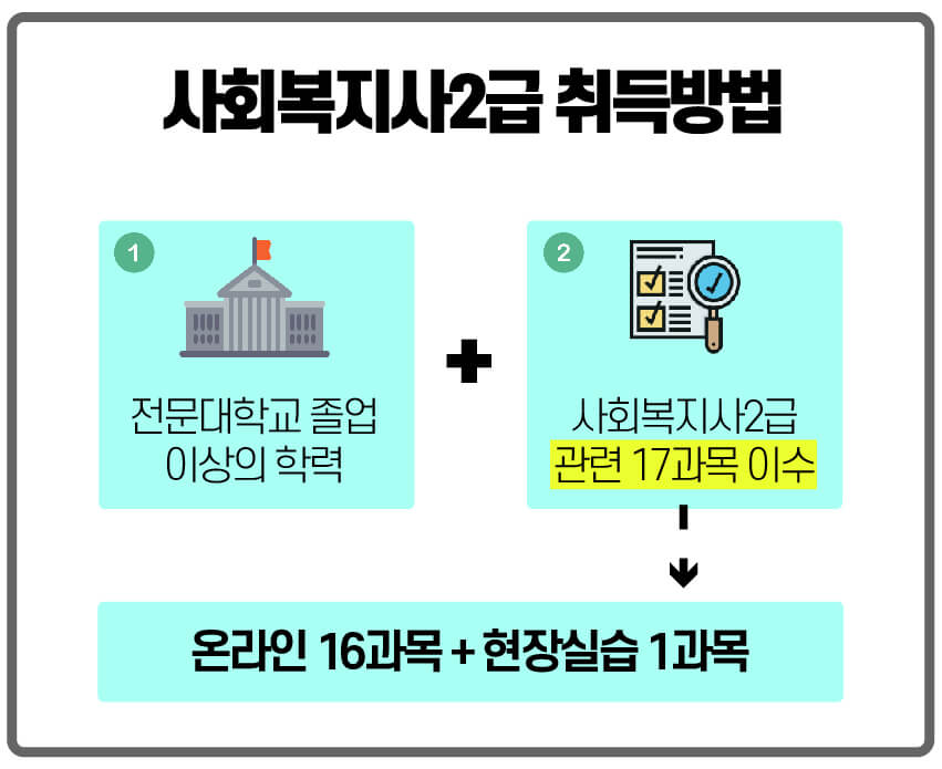 사회복지사 2급 자격증을 취득하기 위해서는 몇 가지 조건을 충족해야 해요. 첫 번째로, 전문대학 이상의 학위를 소지해야 하고, 두 번째로는 총 17과목을 이수해야 해요. 이 17과목은 16개의 이론 과목과 1개의 실습 과목으로 구성되어 있어요.
